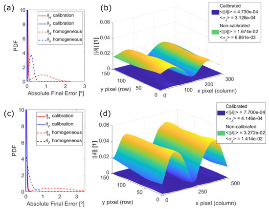 Improvement of the presented calibration for (a,b) the 30 × 20 and (c,d) the 50 × 20 FOV prototype, compared to their respective ideal cases of homogeneous angular resolution. (a,c) Probability density functions of the angular error, being (red) the horizontal and (blue) the vertical scanning direction of (dashed line) the non-calibrated and (solid line) the calibrated case. (b,d) Norm of the final point distance error.