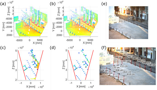 Empirically, these improvements can be directly observed in the measured point clouds. Figure 15 compares a point cloud obtained with the presented calibration method against one assuming constant angular resolution of the same scenario. The scene was captured using the 30 × 20 FOV prototype, which as commented is the one with smaller distance error. Even in that case, the road is not completely straight in the previous point cloud as Figure 15a shows.