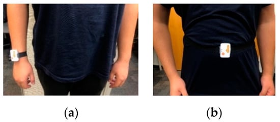 Placement of the wearable inertial sensor: (a) right wrist, or (b) middle waist.