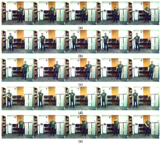 Sample representative image frames for the smart TV gestures application in the C-MHAD dataset: (a) swipe to left, (b) swipe to right, (c) right hand wave, (d) clockwise circle, and (e) counter-clockwise circle.