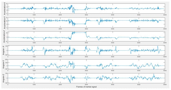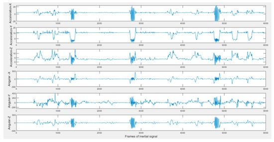 Sample inertial signals in the C-MHAD dataset (top three acceleration and bottom three angular velocity) of 2-min continuous action streams containing the transition movements actions.