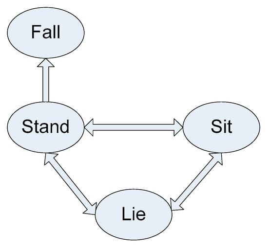 The continuous dataset for this application consists of seven actions of interest reflecting transition movements performed by the same 12 subjects (10 males and two females) who performed the smart TV gestures. As depicted in Figure 4, these actions of interest consist of stand-to-sit, sit-to-stand, sit-to-lie, lie-to-sit, lie-to-stand, stand-to-lie, and stand-to-fall. These transition movements take place between four positions of stand, sit, sleep, and fall as illustrated in Figure 5. Figure 6 shows representative image frames for each action of interest. Ten continuous streams of video and inertial data, each lasting for 2 min, were captured for each subject. This time the Shimmer inertial sensor was worn around the waist. The subjects performed the transitions movements in random order during an action stream while arbitrarily performing their own actions of non-interest in-between the actions of interest. A bed was used for the lying down transition movements while the falling down was done from the standing position to the floor. Figure 7 shows the six inertial signals (three accelerations and three angular velocities) for a sample 2-min action stream of the transition movements application. Figure 8 shows representative images of the action stand-to-fall performed by four subjects (1, 3, 11, 12) illustrating that the actions are not performed in exactly the same manner by each subject.