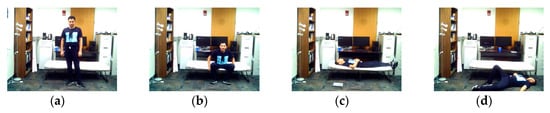 Positions associated with the transition movements application in the C-MHAD dataset: (a) stand, (b) sit, (c) lie, (d) fall.