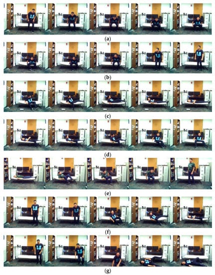 Sample representative image frames for the transition movements application in the C-MHAD dataset: (a) stand-to-sit, (b) sit-to-stand, (c) sit-to-lie, (d) lie-to-sit, (e) lie-to-stand, (f) stand-to-lie, (g) stand-to-fall.