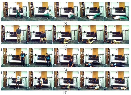 Representative images of action stand-to-fall by (a) subject 1, (b) subject 3, (c) subject 11, and (d) subject 12.