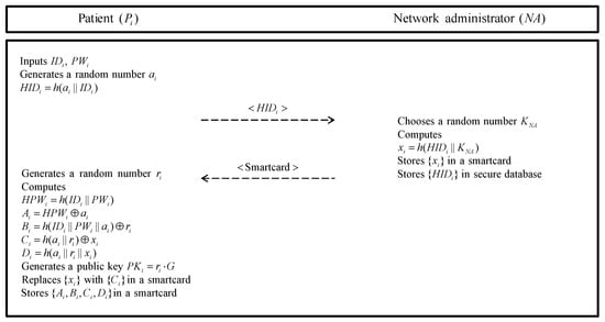- After the receives smartcard from the , the generates a random number as a secret key. computes , , , and . And then, the generates a public key and replaces with in a smartcard. Finally, stores in the smartcard.
