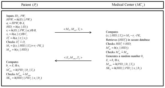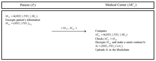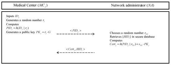 A medical center () must register with the to have a key agreement with patients and exchange information with other related medical centers. The masked identity of the is shared with other entities. This registration phase is also executed over a secure channel. The detailed steps are described as follows and are illustrated in Figure 3.