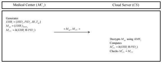 - The generates including , , an information of health record , and EHR’s uploading time . Then, the encrypts using a secure pre-shared key and computes . Finally, the sends to the .
