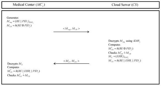 - The other medical center requests the EHR data of the medical center to the cloud server. Next, the cloud server encrypts EHR data of the medical center using a pre-shared secret key and sends it to the other medical center.