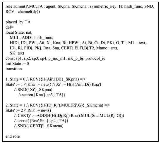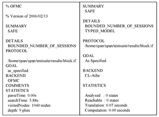 This section shows the proposed protocol can resist against adversary’s replay and MITM attacks to perform AVISPA simulation [,]. The AVISPA tool consists of High-Level Protocol Specification Language (HLPSL) [] to generate input format (IF) of four back-ends, i.e., “On-the-Fly Model Checker (OFMC)”, “Constraint Logic-based Attack Searcher (CL-AtSe)”, “Tree automata based on Automatic Approximations for Analysis of Security Protocol (TA4SP)”, and “SAT-based Model Checker (SATMC)”. Then, the output format (OF) is created and the safety of the protocol is verified using OF. Generally, verification is performed with OFMC and CL-AtSe. The HLPSL syntax of each entity is shown in Figure 9, Figure 10 and Figure 11. Furthermore, the goal and environment of the protocol are shown in Figure 12. Goal and environment describe participants, security goals, and environment conditions. As a Figure 13, the results of AVISPA simulation under OFMC and CL-AtSe is safe. The results show that OFMC has 5.88 search time and visits 1040 nodes with 9 piles depths. Furthermore, the CL-AtSe analyzed in 0.07 seconds. Therefore, our proposed protocol provides security against MITM and replay attacks.