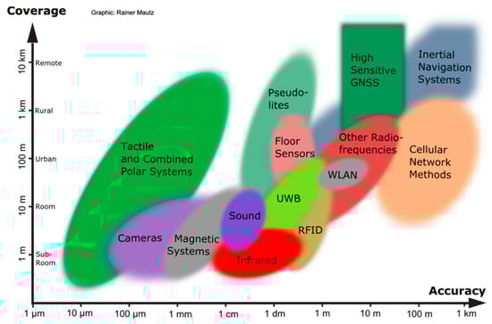 Various technologies have been applied in the field of indoor positioning and navigation, which include techniques based on Radio Frequency (RF), ultrasound, audible sound, magnetic sensors, infrared (IR), and visual analysis-based systems. Mautz [17] presented an overview of indoor technologies along with their accuracy and coverage (Figure 1).