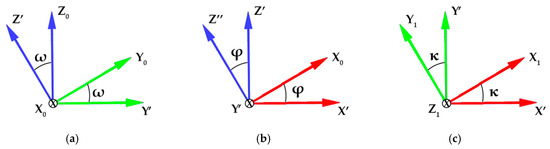 Three rotations about the coordinate axes; (a) primary rotation ω about X0—axis, (b) secondary rotation ϕ about Y’—axis, and (c) tertiary rotation κ about Z1—axis [41].