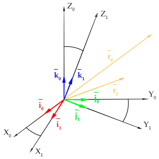To describe the rotations [82], the coordinate system was used, followed by the vector (Figure 3), to which the coordinate system was associated. It is necessary to consider the relations, which occur between the coordinates of the vector in the coordinate system and the coordinates of this vector in the fixed (non-rotated) reference system . The position of the vector before rotation is denoted by , whereas by the standard orthogonal base in the system is designated. are unit vectors along the axes, respectively. Similarly, is a standard orthogonal base in the system.