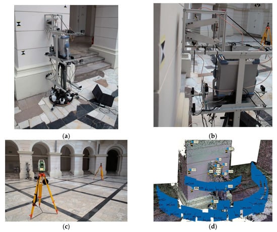 Setup of the proposed sensor system: (a) back view—electromagnetic (EM) sensor mounted on a special tripod with Vector Network Analyzer (VNA) Rohde and Schwarz ZVL13, (b) side view—EM sensor mounted in a wireframe box with VNA and four low-cost cameras (not used in this investigation), (c) the example of a total-station (TLS) position used for control/check points determination, and (d) the visualisation of the full-frame camera Canon EOS 5D Mark II positions.