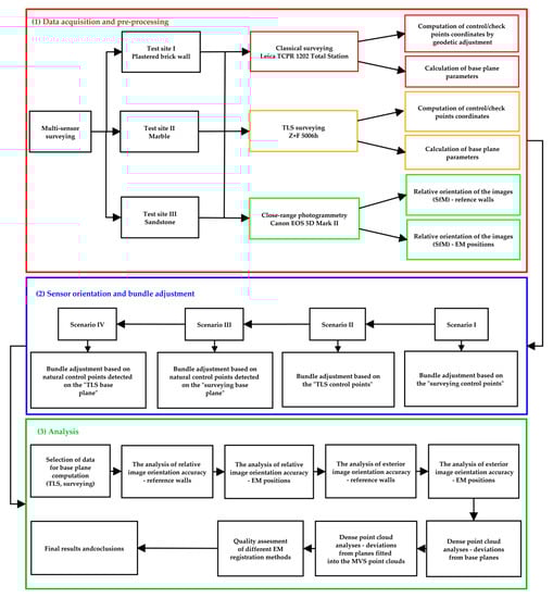 The proposed method of geolocalisation of the sensor system is a multi-stage process based on the combination of commonly used algorithms implemented in Agisoft Metashape and the original software. The proposed method is a novel approach allowing both orientation of the electromagnetic device and its integration with other measuring devices. The whole experimentation involved the acquisition of data on three test sites differing in features, containing materials and surface types commonly present in case of cultural heritage objects. Detailed characteristics of the test sites were presented in the next section. Figure 5 illustrates the scheme of research work and experiments performed.
