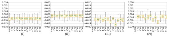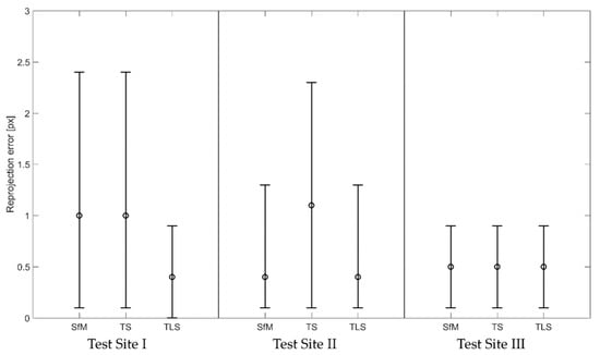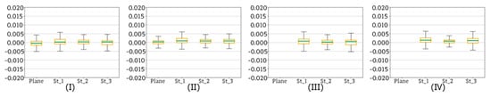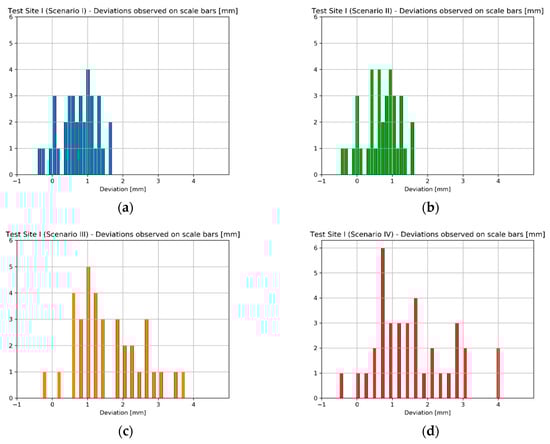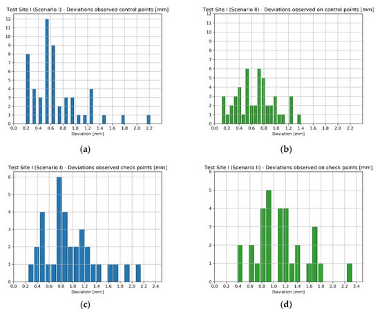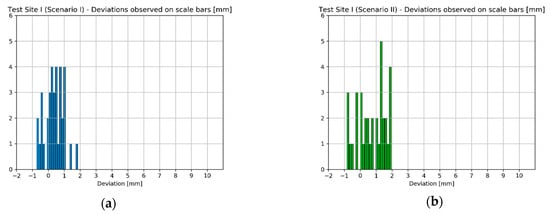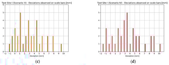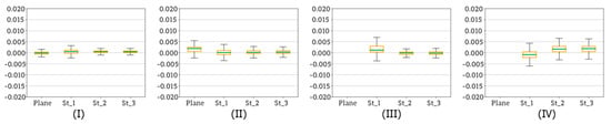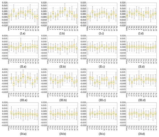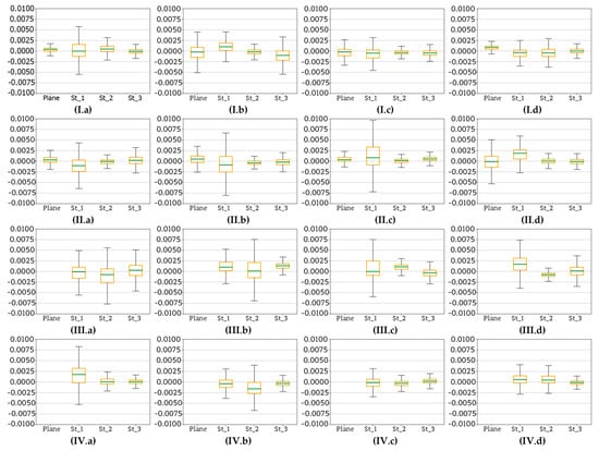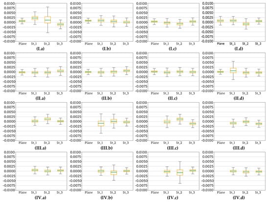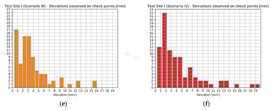 The next series of analyses concerned the quality assessment of reference plane determination based on different data sources, regarding the base planes. The first type of reference planes was determined, using the marked points—the same point sets as those used in the base plane determination, but with coordinates calculated in the bundle adjustment. The second type of reference planes was created for each scenario by fitting planes into dense point clouds resampled with the resolution of 3 cm. For each type, the linear deviations from base planes were calculated (this step was described in detail in the Section 4.9). Comparing the results obtained by TLS and classical surveying, it can be observed that higher accuracy was achieved in case of TLS measurements—only on the Test Site I the results obtained with these two methods were comparable (Table 6). However, it should be noticed that on this test site the accuracy was improved thanks to the increased number of measurement stations.