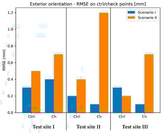 The positions of the sensor and the examined monumental object relative to each other need to be known before the sensor data are processed. To determine the relative position of the sensor, the reference plane needs to be established. For this purpose, two different approaches were applied in order to determine the parameters of abovementioned reference plane (the “base plane”). The first approach relied on the determination of the base plane parameters using the control points, which coordinates were measured by two techniques: classical surveying and TLS (Table 1). The second approach used dense point clouds resulting from further processing of the images with the use of SfM/MVS algorithms (see the Section 4.8 and Section 4.9). The Authors decided to analyse the results obtained by these two approaches separately, because the first one relies on point coordinates measured directly while in the second case the plane was fitted into a dense cloud which is a result of several subsequent stages of processing of an image set. The analyses performed lead to the conclusion that the use of signalised control points provided higher accuracy of determination of the base plane parameters, regardless on the used scenario (I–IV). The measurement accuracy is also influenced by the way the centre of the marked point is determined. On the Test Site I the points were measured from three stations and their coordinates were calculated in the process of geodetic adjustment. On the contrary, on test sites II and III only one instrument station was established, and the points were measured with the polar method. In case of the TLS measurements, the centre of the marker was determined by means of statistical template matching. The use of automatic detection algorithm based on statistical analysis made it possible to eliminate the observer errors, which are a common cause of blunders occurring in classical surveying. In addition, it is worth noting that the amount of time needed to determine the point coordinates with the use of automatic marker detection performed on TLS data is approximately three times shorter than measurements performed with a total station. It is a very important advantage in cases where a cultural heritage objects is concerned. In cases concerning monumental objects, the possible time of measurement is limited due to the tourist traffic and conservation works.