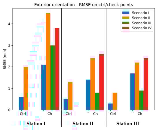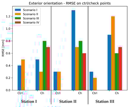 - Scenario I: this scenario involved the use of marked control and check points during the bundle adjustment. Point coordinates were derived from classical surveying measurements. These points were measured both on the images covering only the wall and on the images containing both the sensor and the wall at each station.