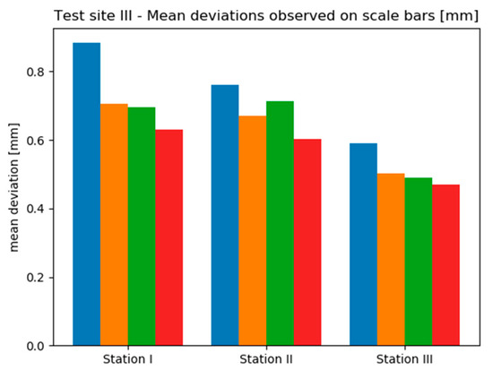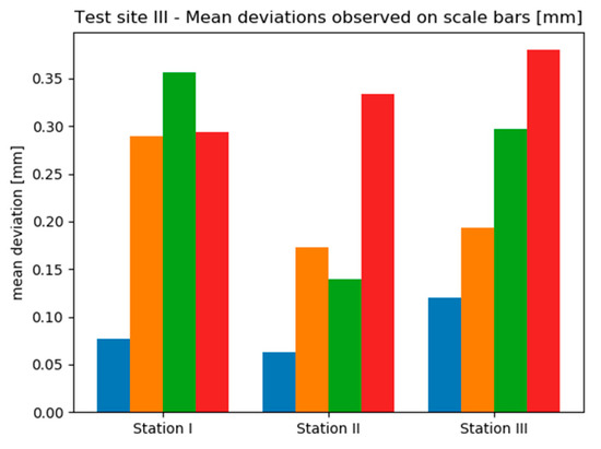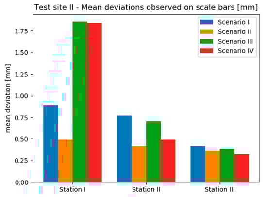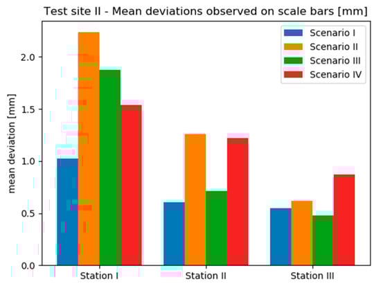 In the case of the Test Site II, where marble was a dominant material, the shape deformations (the deviations from the base planes) reached 1.7 cm. Comparing the results obtained for MVS dense point clouds and for signalised points, it can be seen on Test Sites II and III the approach using signalised points higher accuracy, for the Scenarios II and IV and in the case of the Test Site I similar for all Scenarios (Table 7). Despite the observed differences, the deviations obtained are within the measurement accuracy. The analysis of skews (Table 8) requires the results obtained on Test Site I to be discussed separately from test sites II and III since the structure of the object on this site as well as its texture varies significantly from the others. As mentioned before, unlike test sites II and III, which are characterised by complex and diverse texture, Test Site I is a plain white wall lacking any decorations or other characteristic features. Analysing the deviation values, it can be observed that the deviations obtained on Test Site I are higher than these calculated on test sites II and III. However, the maximum difference between the results achieved on these test sites hardly exceeds 3 mm, remaining below 2 mm in most cases. This means that these differences are within the measurement accuracy and can be considered as negligible. The analysis of results obtained for each sensor station (Table 9) leads to similar conclusions.
