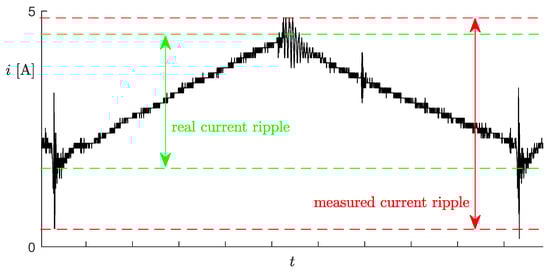Unfiltered inductor current measurement with the indication of the real current ripple (green) and the wrong current ripple, which could be obtained based on the measurements.