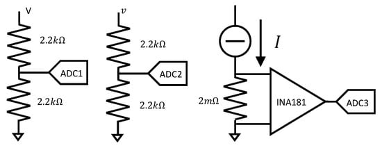The microcontroller generated the PWM signal, and therefore, it imposed the PWM period and duty cycle . The input voltage , the load current , and the output voltage were acquired at the beginning of each PWM cycle through three analog-to-digital converters (ADCs) with 12 bit resolution and were stored in the microcontroller RAM through the integrated direct-memory-access (DMA) interface. The sampling time was therefore variable as it was equal to . The circuits used to scale the measured quantities to the ADC range (V) are shown in Figure 4. In particular, the output current was converted into a voltage through a resistor and a Texas Instruments INA 181 current sense amplifier (right panel in Figure 4), whereas voltages v and V were scaled through voltage dividers (left and middle panels).
