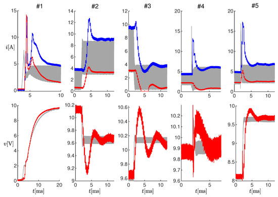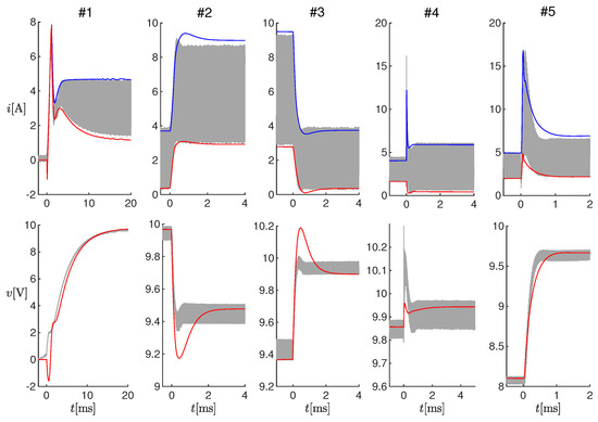 Results of online estimations on Tests #1-#5 (see Table 3). Top panels: measured current (gray curves) and estimated values (red curves) and (blue curves). Bottom panel: measured output voltage (gray curves) and estimated value (red curves).