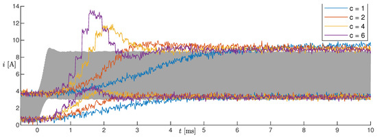 For these tests, the observer was implemented on the microcontroller and operated online together with the SMPS. The tests on the five changes in the operating conditions listed in Table 3 were repeated, where the measurements were performed online by the microcontroller with a sampling period of 200 s. The high microcontroller latency, which implied using a sampling period much larger than the PWM period, constituted actually a problem during fast electrical transients, as the estimated voltage and current transients resulted in being much slower (tens of milliseconds) than the real ones (see the blue lines in Figure 8). In order to compensate for this delay partially, we made the model used by the estimator faster by imposing its capacitance as , with . Figure 8 shows the results of Test #2 obtained with different values of c, from one to six. Notice that with the original capacitance value (i.e., ), the estimated current did not even reach the steady-state value in 10 ms, whereas as c increased, the convergence speed also increased. By setting , oscillations appeared in the estimation, which were not present in the measurements. For this reason, we chose . We remark that scaling the capacitance had a negligible effect on the estimation at steady-state, as the capacitance mainly influenced the output voltage ripple, which we did not estimate.