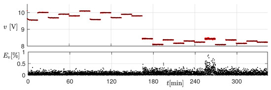 The top panel of Figure 13 shows the measured (black) and estimated (red) output voltage at electrical steady-state for all the considered operating conditions. The relative percent error is shown in the bottom panel. Thanks to the correction term , the two curves almost overlap (the error was always below 1%).