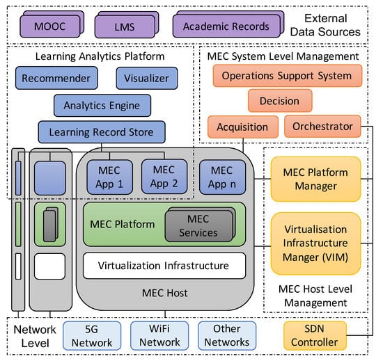 In the data plane, we find the MEC Hosts, which are classroom devices providing computational, storage, and networking resources to execute learning applications. Each MEC Host contains a Virtualization Infrastructure, a MEC Platform and one or more MEC Apps. MEC Apps can be deployed as learning applications, components of the Learning Analytics Platform (commented on in Section 4.1) and other applications like, for example, those oriented to improve the learning courses security and privacy). MEC Apps can be instantiated in Virtual Machines (VM) or containers running on top of the virtual infrastructure. The virtualization infrastructure consumes the hardware of heterogeneous learning devices such as computers, digital blackboards, or cameras and provides computational, storage and networking virtual resources. Finally, the MEC platform provides essential and generic MEC Services needed to run MEC Apps. These services can be specific for particular applications or generic enough to be shared among several MEC Apss. Examples of MEC Services can range from communication protocols to access control mechanisms or cryptographic material.