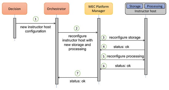 Solution to Requirement 1—Within-scenario flexibility for instructor-configured data collection, analytics, visualizations and recommendations: Easy and flexible reconfigurations of the instructors’ and learners’ applications, such as the one needed in the first scenario, are enabled by our solution. Figure 2 shows the interaction between the components of our architecture to reconfigure the storage and processing capabilities of the instructor host. For clarity’s sake, we show how the architecture reconfigures two MEC Apps running on top of an MEC Host. However, this functionality could be extended to several MEC Hosts and applications. The 1st step of Figure 2 shows when the decision of reconfiguring the instructor host is made by the Decision component. After that, the Orchestrator provides the MEC Platform Manager with the MEC Host and the reconfiguration details of the new storage and processing capabilities. Once received, the MEC Platform Manager interacts with the instructor host to access the storage and processing MEC Apps and reconfigure them (steps from 3 to 6). When the reconfigurations have finished, the action is confirmed to the Orchestrator (step 7).