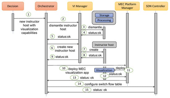 Solution to Requirement 2—Between-scenario flexibility for automatic deployment of the MMLA solutions: Aligned with the capabilities shown in the previous issue and focused on addressing this one, the proposed architecture deploys, configures and dismantles MEC Hosts and their applications in real-time and on-demand. Following the previous example, Figure 3 shows how the components of our architecture dismantle the instructor host when a given application is finished, and deploy new ones with different capabilities for the next class. In the 1st step of Figure 3, the Decision component interacts with the Orchestrator to notify the necessity of changing the instructor host. After that, the Orchestrator provides the VI Manager with the required info to dismantle the MEC Host (step 2). Once the notification is received, the VI Manager dismantles the host and confirms the Orchestrator the action (steps 3–5). When the old instructor host has been dismantled, the next step is to deploy a new MEC instructor host with more hardware resources (processor and graphics). This process is shown from 6 to 9 in Figure 3. At this stage, our architecture has already deployed a new MEC instructor host with enough hardware resources to meet the requirements of the next learning analytics application and the next step is to deploy a new MEC App with visualization tools and capabilities. For that, the MEC Platform Manager is the component in charge of deploying, configuring and confirming the new MEC App (steps from 10 to 13). Finally, the Orchestrator communicates with the SDN Controller to include a new rule in the switch flow table, and route the network packets sent and received by the new instructor host and its applications (step 14).