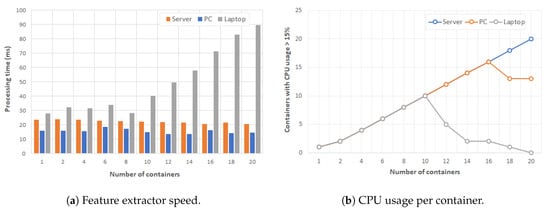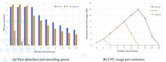 In order to evaluate the performance and efficiency of the Face Recognition application in Docker containers, our testbed used a H.264 video source with 640 × 360 image size and applied the HOG algorithm in each video frame. We used the analyzed frames per second (FPS) as performance evaluation index to assess how fast the HOG algorithm is. If a configuration has higher FPS value, it has higher video quality and can produce smoother video. Figure 4 shows the experimental results obtained when increasing the number of containers for each type of learning device. The left graph depicts the maximum analyzed FPS for each configuration and the right graph shows how many CPU cores are overloaded.