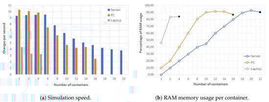 Given the results shown in Figure 6 and that our physics simulation required 4 CPS at least to show a fluent animation, a laptop served only one container with our simulation. However, the server and PC could achieve 20 and 14 containers, respectively. Moreover, the memory was full and additional containers were rejected when the server launched more than 20 containers, the PC 14 containers, and the laptop 2 containers. These experimental results show that a high-data consuming simulation can be used in different configurations, e.g., a laptop/tablet could be used for a single student and a server to up to 20 students in the classroom.