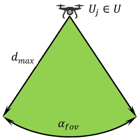 Both parameters are given by the technical construction and principles of the sensors. The sensors are homogeneous, i.e., all UAVs are equipped with the same type of sensors. Each UAV is able to monitor objects of interest located within the field of view of its sensor and not farther from the UAV than allowed by the maximum distance constraint. This principle in a plane is shown in Figure 1 where the green area (called object detection range) represents the space, in which the object, if located in this range, is detected by an UAV.