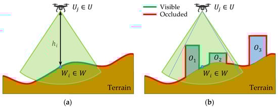 Figure 2. Determination of points monitored by an UAV: (a) without obstacles; (b) with obstacles.