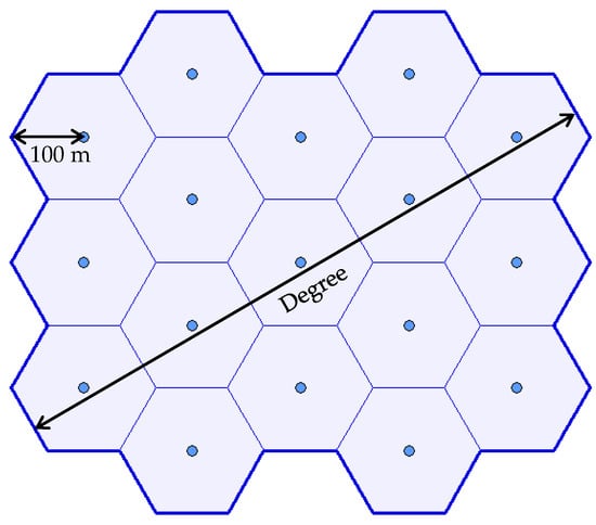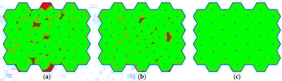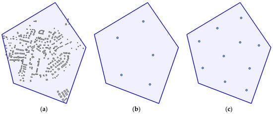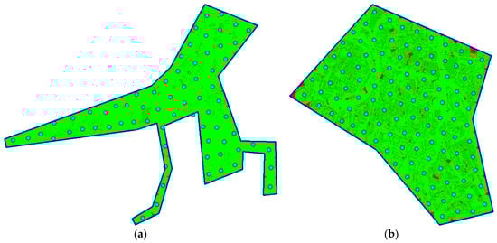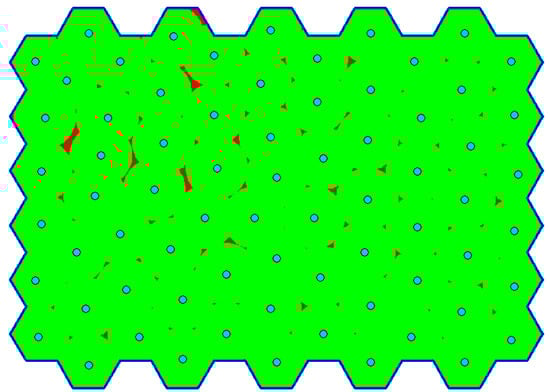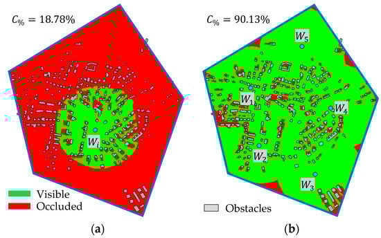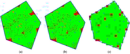 Figure 3a shows an example of the real situation from the top view. The polygon (blue line) encloses the area of interest; grey objects are obstacles (buildings in this case). Green area represents visible points in set . Figure 3b shows the same situation, but this time, five waypoints are deployed. The total visible area is given by the unification of sets for individual waypoints according to Equation (2). The total coverage of the area of interest through deployed waypoints is calculated according to Equation (3) as a ratio between the number of visible points (denoted as ) and the number of all points in the area of interest (denoted as ):