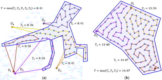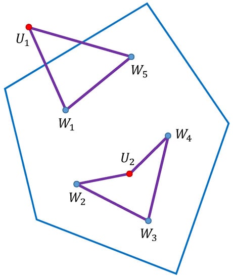 A simple example with two UAVs (red dots) and five waypoints (blue dots) is shown in Figure 4. The routes (violet color) are and .
