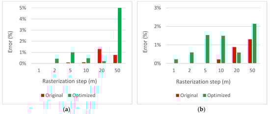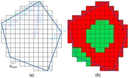 For calculation of , the number of visible points in the area of interest needs to be determined—see Equation (3). To get this number, any point lying inside the area of interest must be evaluated if it is visible from any waypoint or not. In general, there are an infinite number of points P inside the area of interest, which is, of course, not possible to evaluate from the practical point of view. The rasterization of the area of interest is a possible solution to this. The principle is shown in Figure 5a. The area is evenly covered by a finite number of points using the Sukharev grid. The rasterization step determines the total number of points ; each point lies in the middle of its square. The visibility of each point in is evaluated independently on one another; in this way, set of visible points of size is created as illustrated in Figure 5b. The approximation of is then calculated according to Equation (14); the precision of the approximation can be controlled by the rasterization step :