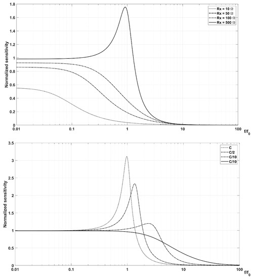 Variation of the frequency response, in terms of normalized sensitivity, with termination resistance (top) and total capacitance C (bottom).