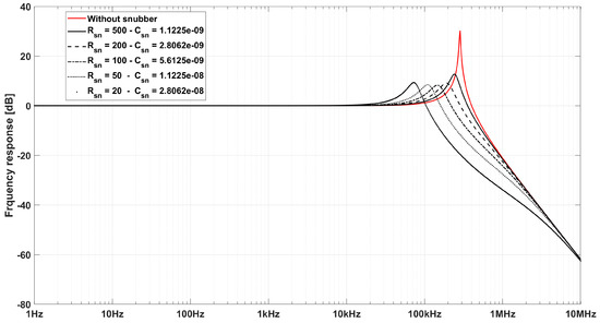 The effect of a snubber circuit in reducing the resonance peak is shown in Figure 7 along with that of the and parameters in dumping the peak and determining the new system resonance frequency, for the same snubber cut-off frequency.
