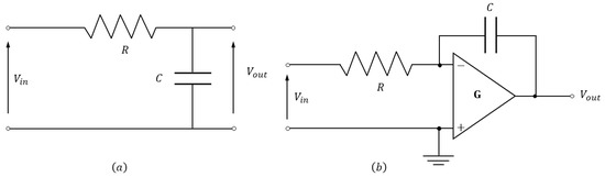 As mentioned in Section 2, to obtain a signal proportional to the flux linked by an inductive sensor, the raw voltage signal from the sensor must be integrated. A simple RC circuit, as shown in Figure 8a, provides a good approximation of an ideal integrator for high-frequency signals. The transfer function between the output and input voltage of the integrator circuit is