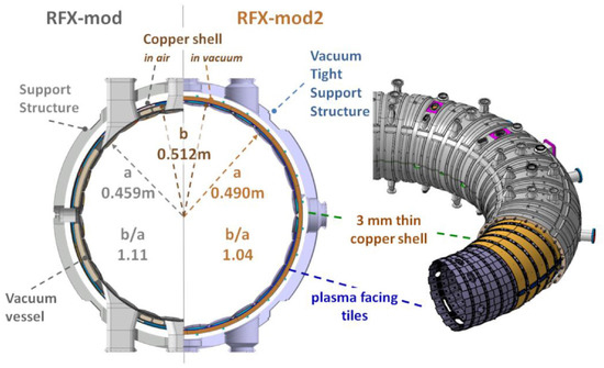 - Piovesan, P.; Bonfiglio, D.; Auriemma, F.; Bonomo, F.; Carraro, L.; Cavazzana, R.; De Masi, G.; Fassina, A.; Franz, P.; Gobbin, M.; et al. RFX-mod: A multi-configuration fusion facility for three-dimensional physics studies. Phys. Plasmas 2013, 20, 056112. [Google Scholar] [CrossRef]