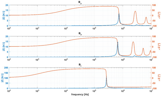 where is the ratio between the coil and the terminating resistances, and are the quality factor and resonance frequency of the circuit. respectively. The relation in Equation (10) shows that the higher is , the lower is the sensitivity, which means that low coil resistance and high input resistance are desirable. The parameter has to take into account not only the sensor coil equivalent circuit parameters, but also the transmission line capacitance, which should be added as connected in parallel. Of course, this is true only if the resistance and series inductance of the cable are both negligible. In Figure 6, the typical behavior of the frequency response with termination resistance and total capacitance C are reported on the top and on the bottom, respectively.
