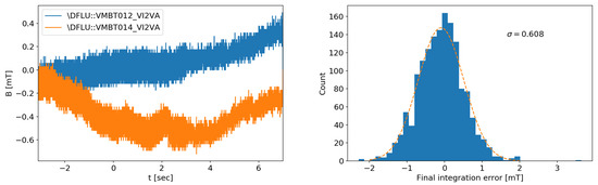Examples of integrated signals (left) and distribution of final integration error of the analog integrators of RFX-mod after 10 s, from toroidal field sensors on eight “dry” pulses (1510 signals (right).