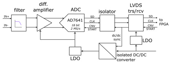 The noise characteristic of a precision ADC (AD7641, 2 MSamples/s, 18-bit SAR ADC) has been measured by taking advantage of the existing modules of the ATCA-MIMO system [29,30]; the basic structure of the module is reported in Figure 17. For the subsequent test shown, the input stage has been disconnected and the reported test have been performed with both the on board synchronous DC/DC converter and with a separate linear power supply.