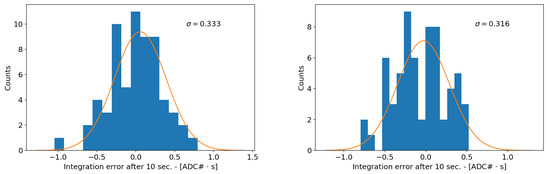 Histograms of the final integration values due to the integrated noise with DC/DC (left) and linear power supply (right).
