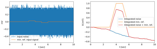An estimation of the expected output with the reference signal of Figure 14 can be obtained by adding the equivalent input reference signal (Figure 21, left) to a noise sample. After the numerical integration, the desired signal can be successfully identified with an overall acceptable error (Figure 21, right), and it can then be further corrected by suitable post processing, as the integrated error is fairly linear.