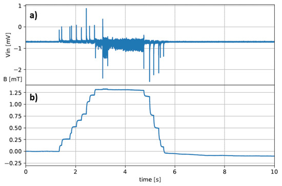 The direct acquired signal is reported in Figure 22a and the numerical integration result in Figure 22b, which appears to be very good. Note that the level of the signal in Figure 22 top, is in the very low range of the ADC, with the full signal scale at V.