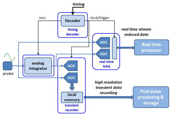 As mentioned in Section 1, the complete replacement of existing analog integrators with direct numerical integration of the digitally acquired signal has been chosen for the new magnetic measurement system of the upgraded RFX-mod2 experiment allowing a significant reduction of the hardware complexity. In principle, for each sensor, this system would require four ADC channels, two for the integrated signal and two for the derivative component, since the channels are duplicated for the high resolution transient data recording and for the real-time control system. Since the foreseen number of channels is quite high (about 1700), the direct digital integration performed numerically offers a dramatic advantage over its analog counterpart in term of compactness, cost, reliability, deployment, calibration and maintenance. Moreover, the architecture is suitable for performing the numeric integration needed for real-time plasma control, while simultaneously recording the / signals needed for the study of the fast MHD dynamic processes taking place inside the plasma [33,34].