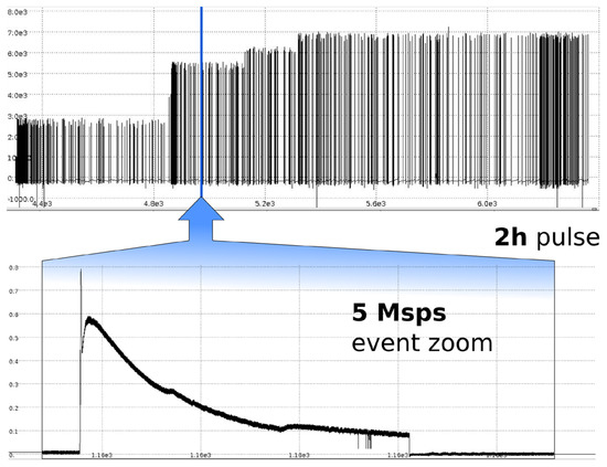 The flexibility provided by the configurable FPGA also allows the inclusion of more sophisticated triggering mechanisms and a deeper integration with the timing systems. An example is given by the acquisition of fast transients requiring high speed sampling only in a given, dynamic ROI. This technique has been applied to NIO experiment [35], a small radio frequency negative ions beam source with an electrostatic particle accelerator stage composed of several high voltage grids. In this environment, the occurring breakdown events lead to a rapid change in the measured currents and voltages of the grid power supply that need to be measured in detail [36]. To this purpose, a subset of the FPGA functionalities given above and required for magnetic DAQ system had already been implemented on a Red Pitaya device: the trigger logic to detect the occurrence of the event, the pre and post trigger sampling logic and the FIFO/DMA data transfer to computer memory via the GNU Linux driver. This implementation allowed the proper handling of the measurements, as shown in Figure 25.